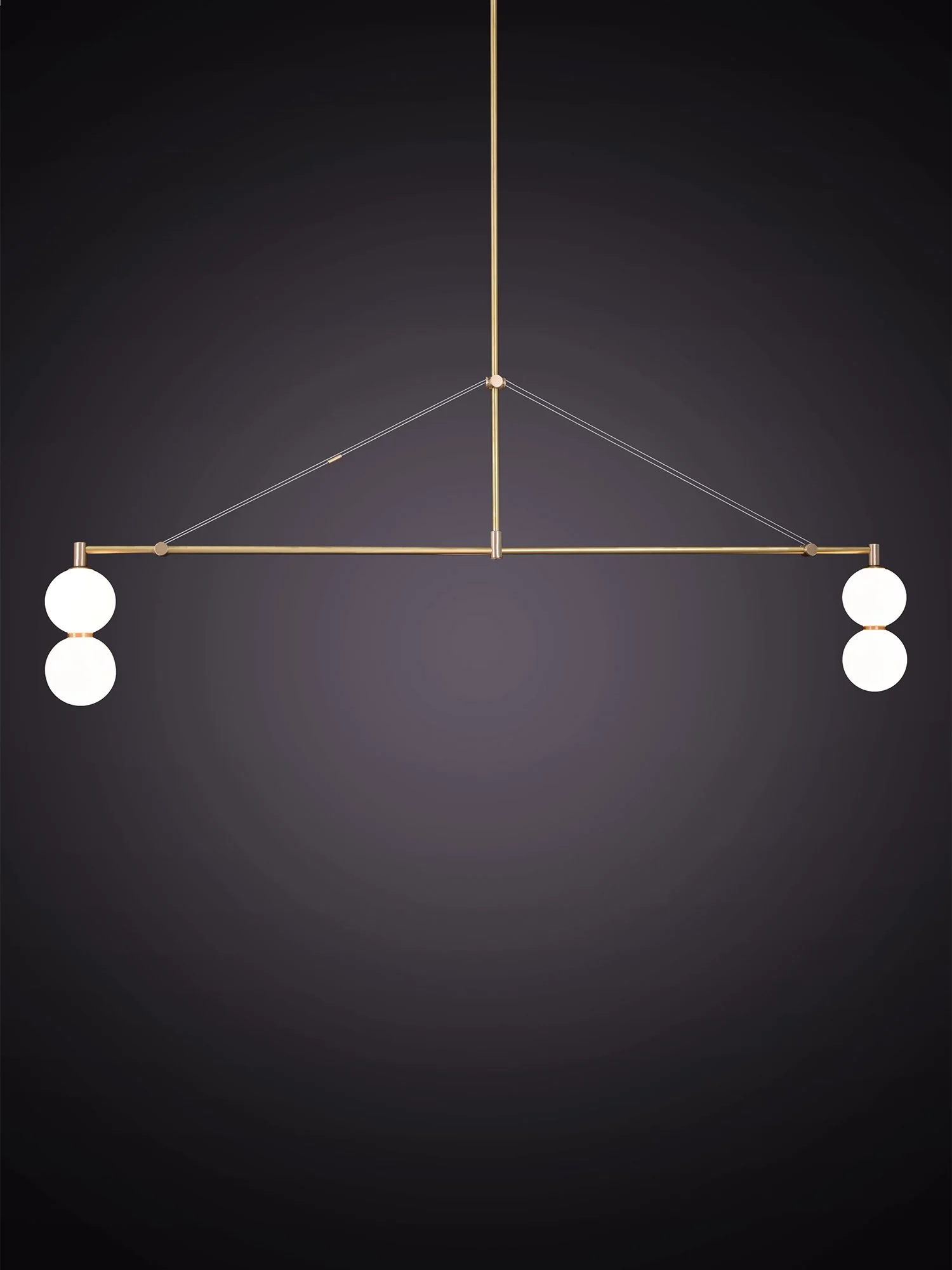 A line of delicate white glass orbs stacked on top of one another to create an echoed glow of light and the illusion of subtle reflections.