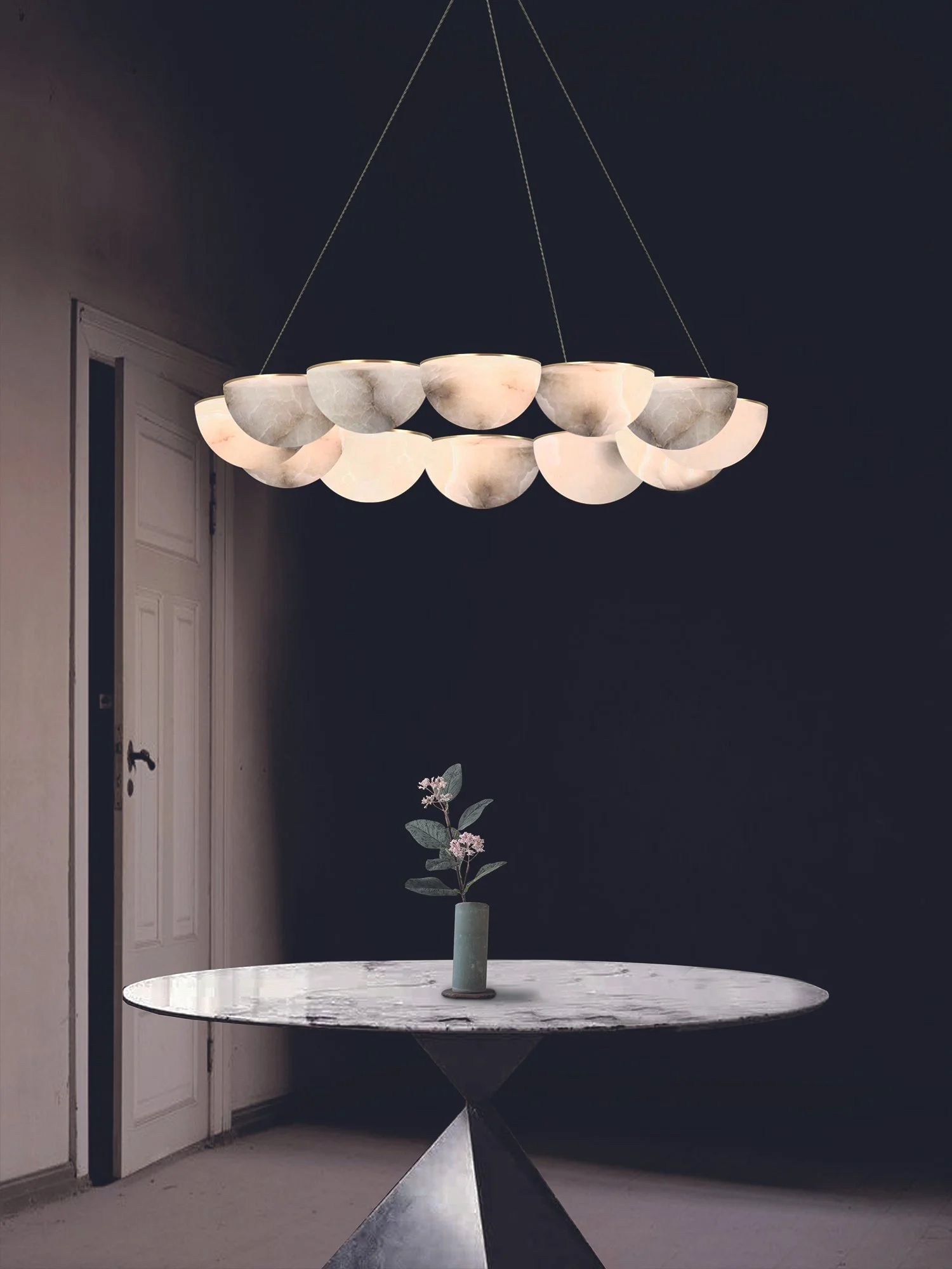 Hemisphere is designed to be a striking centerpiece. The chandelier is made form a circular array of alabaster diffusers joined together to create a sculptural halo of stone.