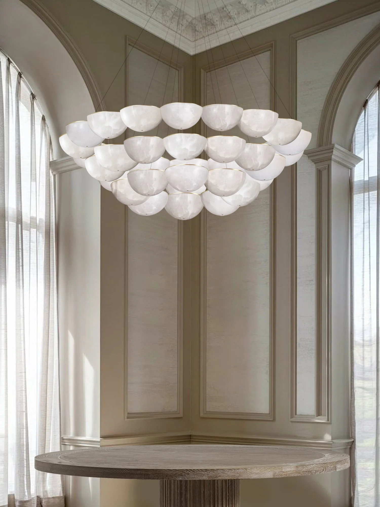 Hemisphere is designed to be a striking centerpiece. The chandelier is made from a circular array of alabaster diffusers joined together to create a sculptural halo of stone.