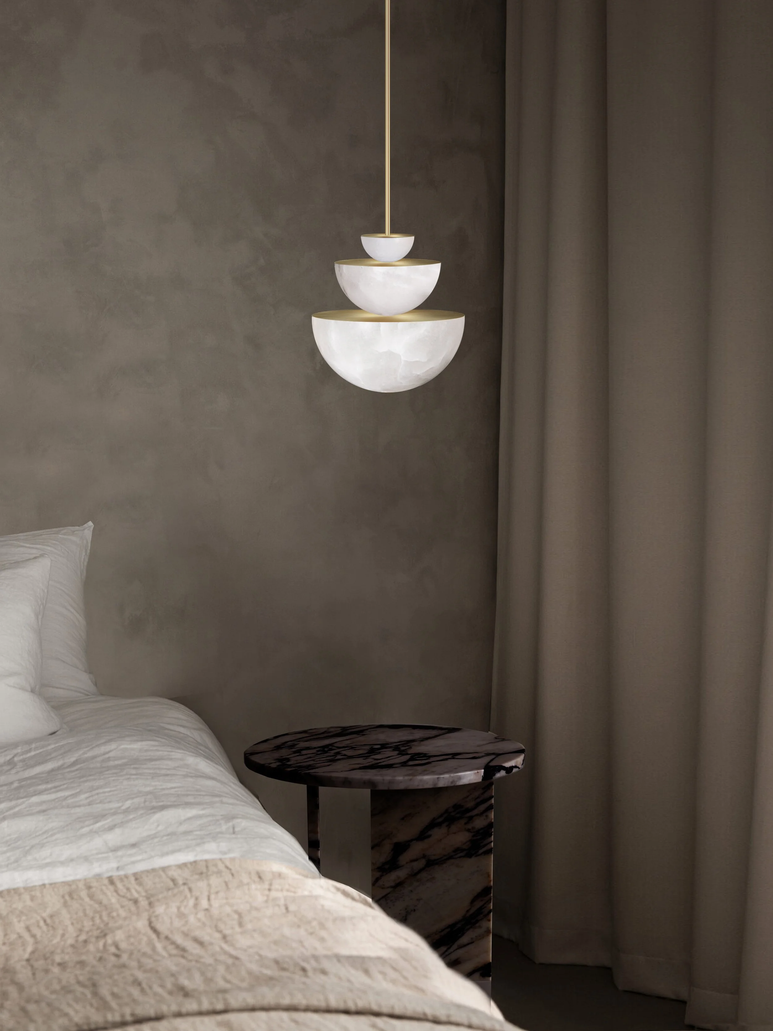 Hemisphere is designed to be a striking centerpiece. The pendant is made from an array of alabaster diffusers, stacked on top of one another to create a sculptural, geometric design.