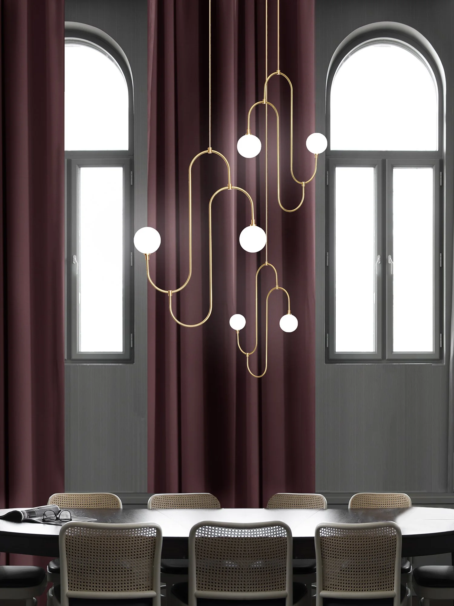 Inspired by the repeated patterns and sculptural form of 1930s jewellery design. The pendant incorporates hand bent brass arms that hold pearl white crystal glass, creating a decorative, functional lighting feature.